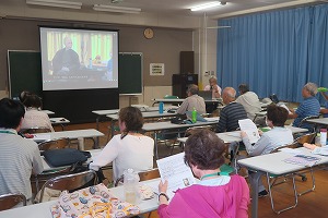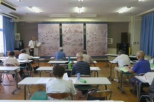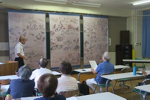 三木市別所町東這田の法界寺には、三木合戦軍図三幅が伝わっています。 かっての三木城主別所長治公自刃の祥月命日には、毎年法要が行われていますが、この際合戦の 模様を詳細に描いた軍図三幅を本堂に掲げ、これを指し示しながら合戦の次第を説き聞かせる、いわ ゆる「絵解き」が行われています。 今回は、生田さんを講師に迎え、三木合戦軍図絵解きをしていただきました。 今から約440年前にこの三木の地で繰り広がられた戦いの様子が目の前に現れました。 |